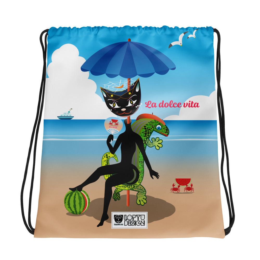 ドローストリングバッグ・黒猫ガール「甘い生活」【IL005- WP021】
