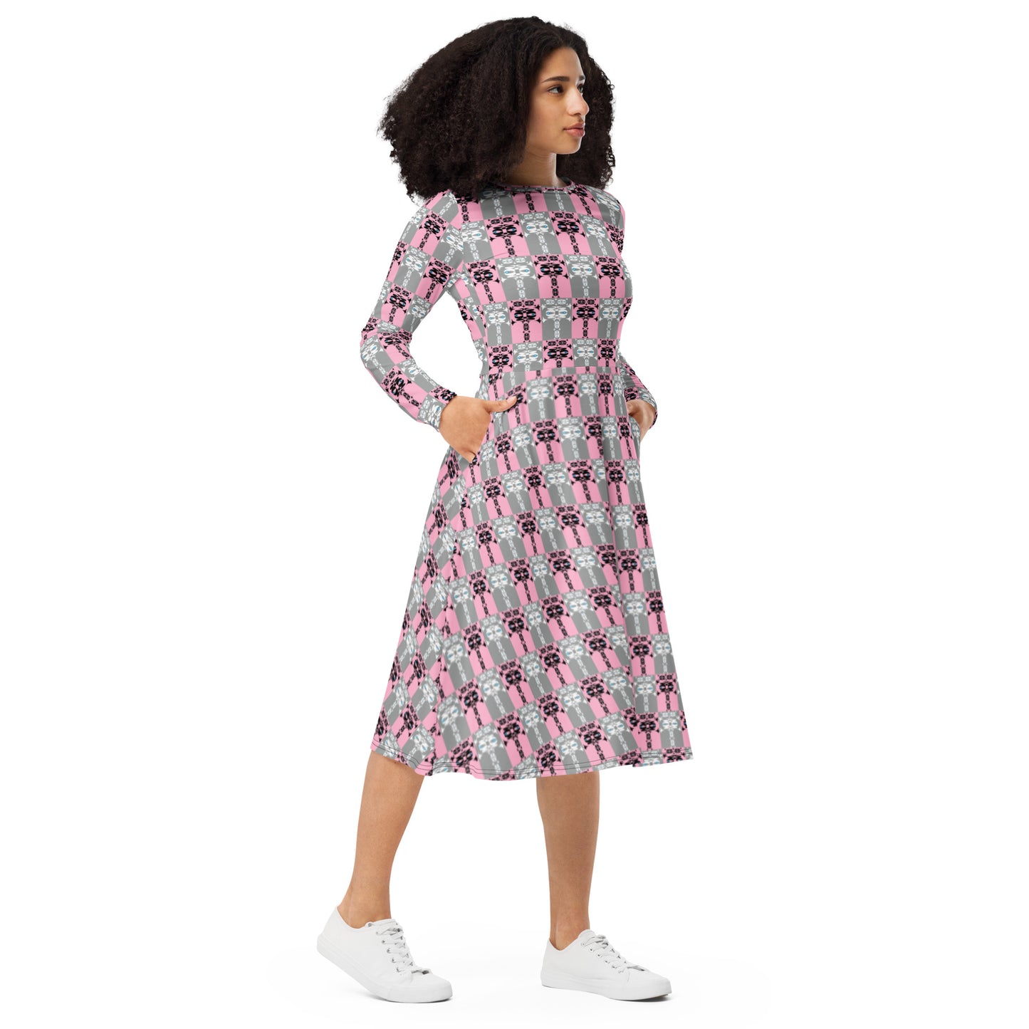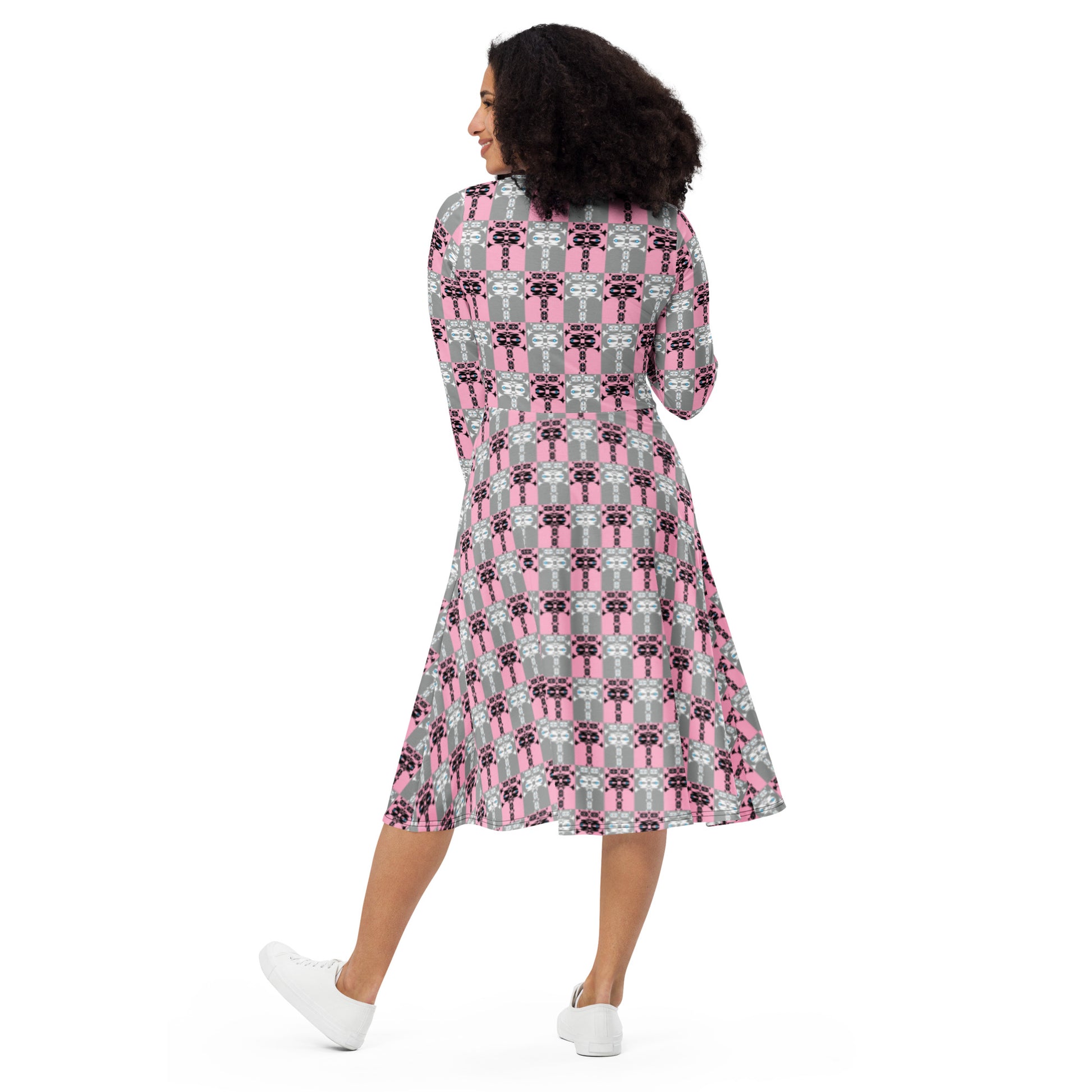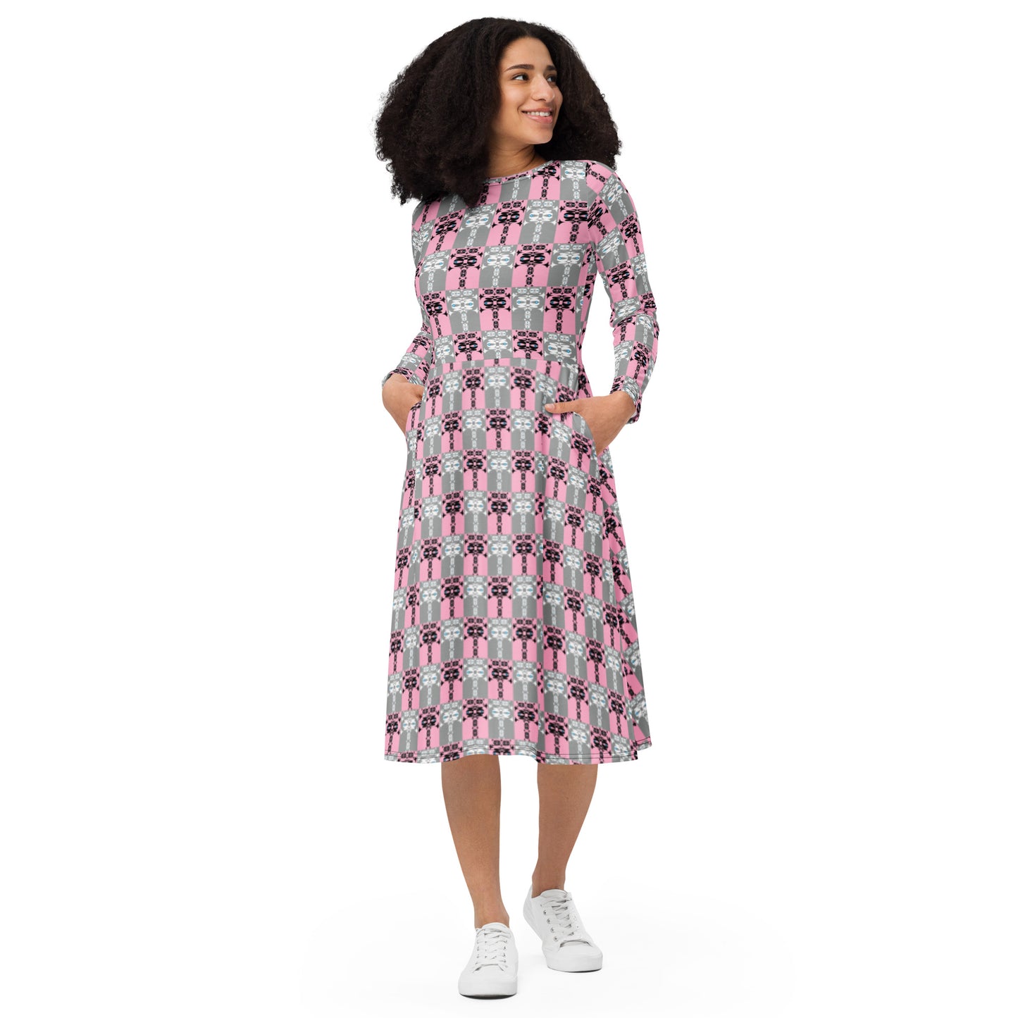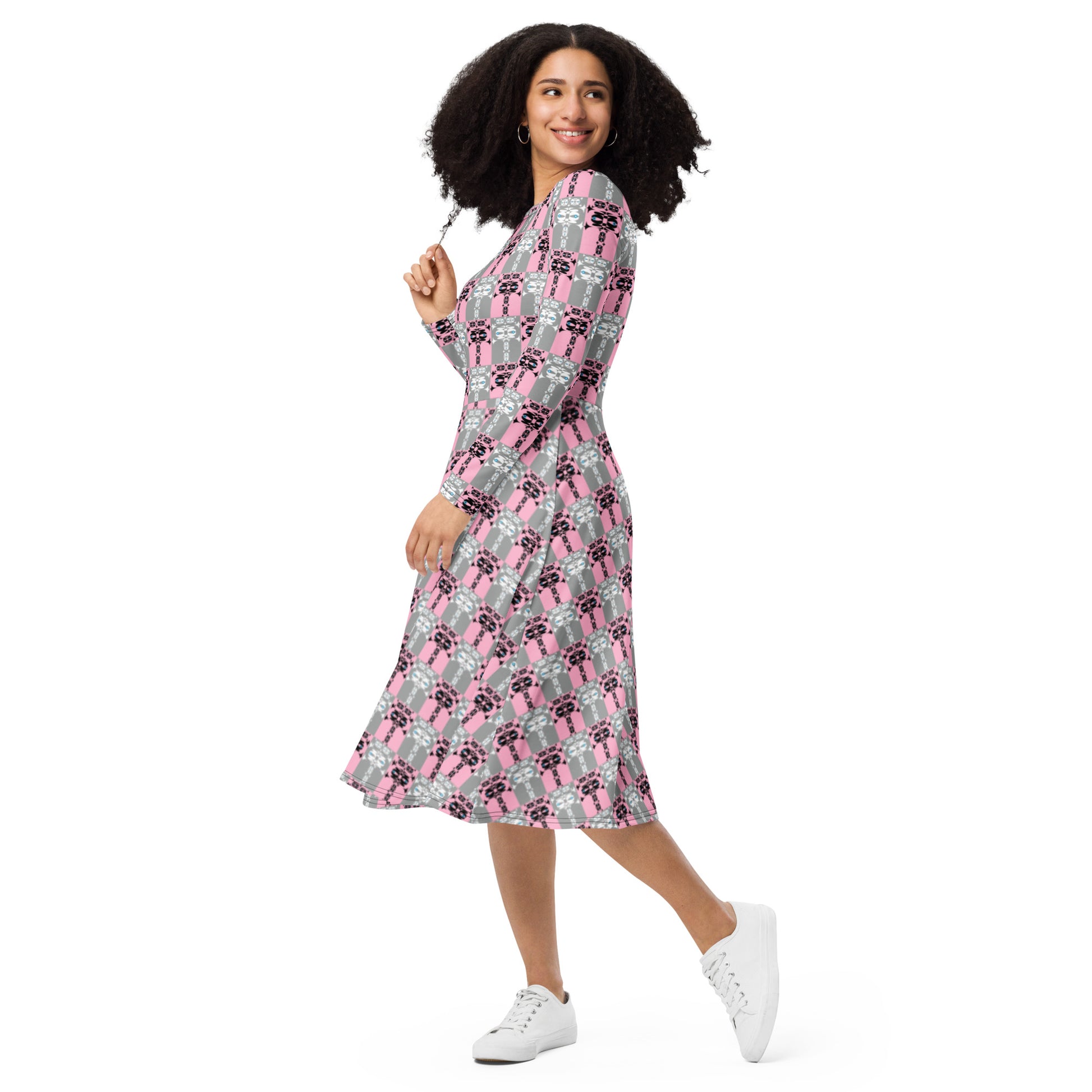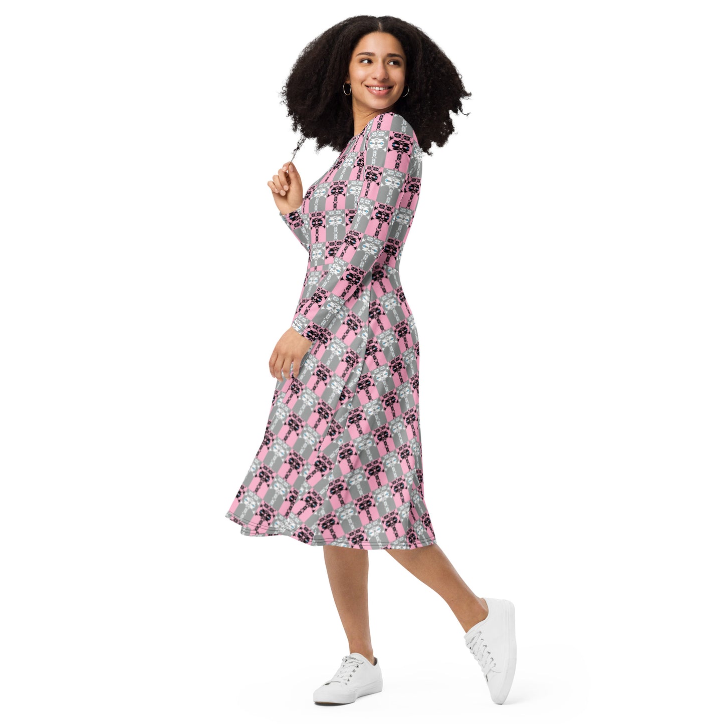 全面プリント長袖ミドルワンピース・イジドール格子ピンク【CA001- MOP002】