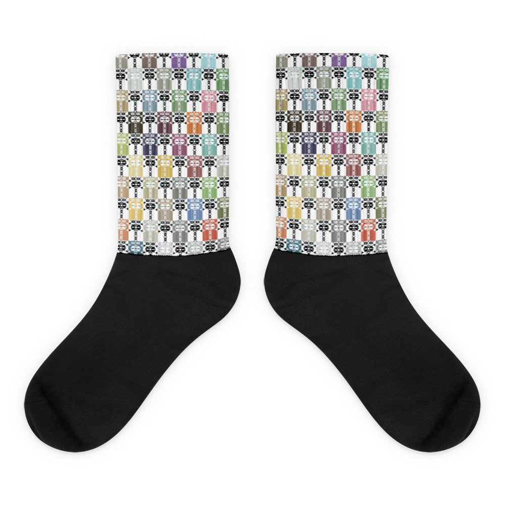 底の部分にクッション性があるためとても履き心地の良い靴下。足先は黒く、足首に沿って鮮やかで色褪せない色で印刷が施されます。
