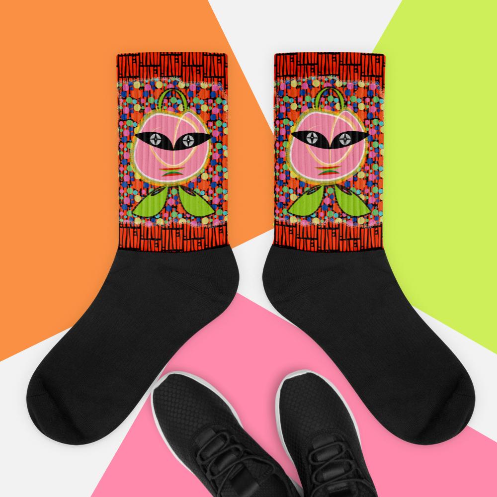 底の部分にクッション性があるためとても履き心地の良い靴下。足先は黒く、足首に沿って鮮やかで色褪せない色で印刷が施されます。